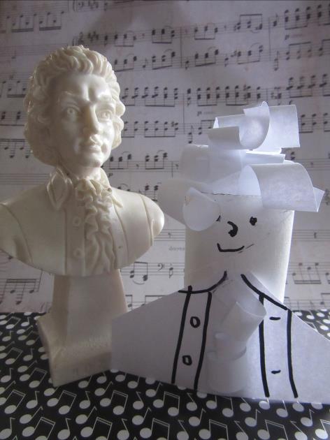 Step 1: Paint the paper roll white (or wrap with white paper and glue the paper on). Step 2: When the paint has have your child dried draw a little face. Step 3: Cut a slip of paper into a long triangle and then cut small stripes. Step 4: (Parent step) Using scissors as if you were curling ribbon, curl the small strips of paper to create the curls on a wig. Step 5: Have your child glue the stripes onto the long triangle to create a little wig. Step6: Apply glue onto the bottom of the flat end of the triangle wig and then press to glue it inside the toilet paper roll over the face. The long point end of the triangle will hang over the back like a wig. Step 7: Cut out a wide triangle to represent the shoulders of the bust of Mozart. Cut the pointy tip off the triangle and then draw a collar and some buttons. Cut out a long thin slip of white paper and curl it to create the ruffle of a cravat.