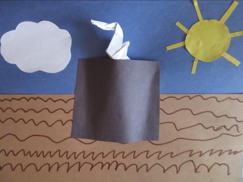 Materials: White paper cut into a square for origami, brown paper, blue paper, black paper, white and yellow paper (optional), child safe scissors, glue stick, damp cloth for sticky fingers.