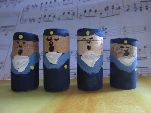 Step 1: Paint the bottom of the cork and the very top (as a cap) Navy blue and let dry. Step 2: Add a light blue collar, v-neck on the front and straight across on the back and let dry. Step 3: Add white between the collar. (The uniform officially has three stripes on the collar as well but corks are too small to paint that kind of detail). You could also add a small yellow dot to the front of the hat and the chest as the crest (again this isn’t accurate to the real uniforms but will due for a little cork representation). Step 4: Use a Sharpie Marker to draw a little face. DIRNDL AND LEDERHOSEN CRAFT: