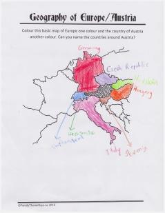 Austria is a European country and is surrounded by eight other countries. Print out a copy of my Basic Geography of Europe/Austria Worksheet and have your child colour all the different countries. Together as a family research and find the names of the countries and label the map. Please excuse an inaccuracies; Europe was hard to draw!