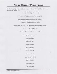 LANGUAGE IN AUSTRIA: The official language of Austria is German. Print out my Common German Words for Austria Printable and try to say some everyday phrases in German. I apologise for any errors. Here is where I found the words I used: http://www.europa-pages.co.uk/lessons/german-basics.html, and http://www.360travelguide.com/Austria/languages.asp, and http://www.tripadvisor.ca/Travel-g190410-s604/Austria:Important.Phrases.html, and http://www.wikihow.com/Count-to-20-in-German WEBSITE: For more information about Austria, specifically traveling there, try this site: http://www.austria.info/us To see the top ten tourist attractions in Austria check here: http://www.touropia.com/tourist-attractions-in-austria/ For information about Christmas traditions in Austria look here: https://www.msichicago.org/scrapbook/scrapbook_exhibits/catw2004/traditions/countries/austria.html and http://www.whychristmas.com/cultures/austria.shtml