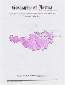 GEOGRAPHY OF AUSTRIA: Print out a copy of my Basic Geography of Austria Worksheet and have your child colour it. Then together as a family search an atlas or online for the capital city of Austria. Have your child write the answer on the worksheet. We also wrote the names of the main river that flows in the north of Austria. Please excuse any anomalies in the shape of the country as the worksheet was drawn by me and hence is not perfect.