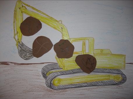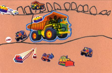 Step 1: Give your child the stickers and paper and have him/her either make a scene or a collage with them. Step 2: (Optional) See if your child wants to embellish the picture with markers or crayons by drawing a setting for the construction vehicles.