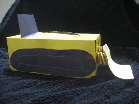 TISSUE BOX BULLDOZER: Materials: empty tissue box, yellow or orange paint, paint brushes, old clothes or art smocks to protect clothes, news paper or plastic to cover the table/work space, black and yellow craft paper, white crayon, white glue and glue stick, child safe scissors.