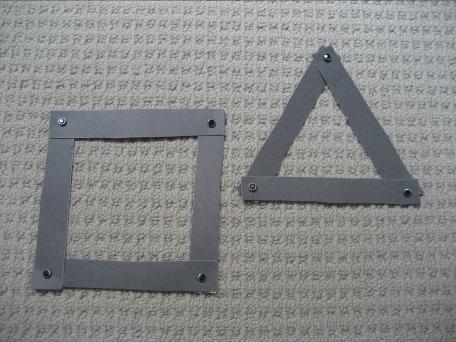LEARNING ACTIVITIES: WHICH IS THE STRONGEST SHAPE: Materials: Construction paper (stiffer than regular craft paper), child-safe scissors, paper fasteners (we used scrapbooking brads to make them fancier), a needle or push pin (adult use only). Step 1: Cut out 7 strips of construction paper of matching size. Step 2: (Parent step) Using the needle or push pin make a pin hole centered and near the top of each end of each strip of paper. Step 3: Put a paper fastener through the pin hole and then push it through a second strip as well. Do this to create a square out of four strips of paper using 4 paper fasteners and then do this to create a triangle using three strips of paper and 3 paper fasteners. Step 4: Have your child test the strength of the square by trying to push the strips. They will move easily because a square is not a strong shape. Step 5: Have your child then test the strength of the triangle by trying to push the strips. They will not move because a triangle is a very strong shape. Step 6: See if you can find examples of the use of triangles to make things stronger.