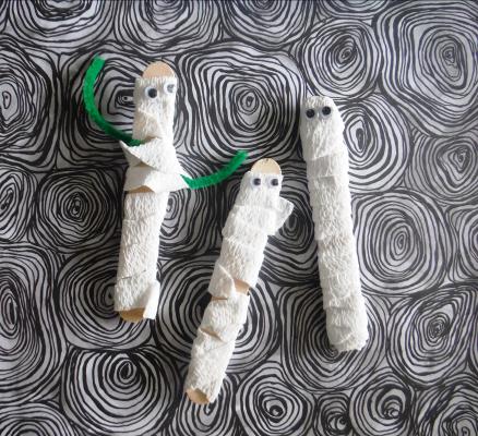 MUMMY CRAFT STICKS: Materials: Craft sticks, first aid bandages (preferably the self sticking kind...that worked really well with this craft), googly eyes, white glue, (Optional) Pipe cleaners. Step 1: Wrap the first aid bandages around the craft stick until happy with the look. My Eldest liked it wrapped tightly; my youngest wanted a loose wrap because that looked more like the monsters. (Optional: my Youngest wanted arms on one of his mummies so we used green pipe cleaners and wrapped those around the craft stick first). NOTE: If you don’t have self sticking bandages you will ned to glue them on with white glue and then let them dry on wax paper. Step 2: Glue the googly eyes onto the craft stick.