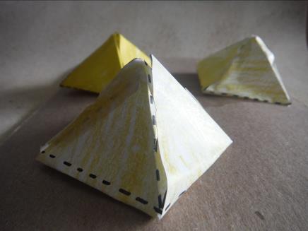 PAPER PYRAMIDS: Materials: A copy of my Paper pyramid Template, crayons or coloured paper, glue stick and clear tape, (Optional) a piece of hard brown cardboard (like from the back of a package of colored paper or from a cereal box). Step 1: This craft can be done two ways. You can cut out the template and use it to trace onto coloured paper or you can colour right on the template. My kids chose to colour on the template so to make three pyramids we used three printable templates. Step 2: Once the pyramid(s) are cut out you fold on the dotted line or where the dotted line would have been if you are using coloured paper) and apply glue stick glue to the tabs. This part might be tricky for younger kids. Help them pinch the sides one at a time together and if necessary use a little clear tape. Step 3: Continue with all the tabs and then use clear tape with the last tab as that one is hard to glue. Step 4: (Optional): We decided to glue our pyramids to a small piece of hard brown cardboard to resemble the dessert.