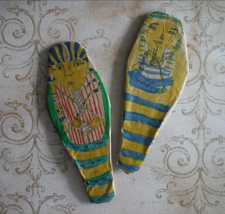 CARDBOARD SARCOPHAGUS: Materials: a copy of my sarcophagus template, a small piece of cardboard (the size of the template), brown paper (like from a lunch bag), markers, and clear tape. Step 1: Have your child cut out the sarcophagus template (or have your child draw on the template as a colouring sheet to simplify this craft). Step 2: Have your child trace the template onto a piece of cardboard and then cut the cardboard out. Younger children may require help as cardboard is quite thick and thus a little tricky to cut. Step 3: Use the template on the brown paper and trace lightly in pencil. Now have your child draw and colour a sarcophagus picture onto the brown paper. We had some library books open on the table to use as guide lines. Step 4: Cut around the shape of the sarcophagus on the brown paper but not along the template sketch. This time you want a wide gap around the shape because you will be wrapping it around the cardboard. Step 5: If your child desires, have him her place the previous mummy craft onto the piece of cardboard as if laying the mummy inside the tomb. My children didn’t want to wrap up their mummies so we skipped this step. Step 6: Next, wrap the cut out and colour brown paper around the cardboard (covering the mummy) and fold the extra paper around the back (to seal the mummy in the tomb) to create the top of the sarcophagus. Tape the folded paper onto the back of the cardboard.