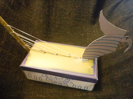 EGYPTIAN HARP CRAFT: NOTE: For information on Ancient Egyptian Music check here: http://www.touregypt.net/featurestories/music.htm NOTE: This is a more difficult craft. Sometimes we like to challenge ourselves with a craft and for this Theme Day, the harp was a challenge! Materials: empty shoe box, old ruler (a paint stir stick would work, too), packing tape, paint, long elastics, brads or paper fasteners, a thumb tack, hard construction paper, ball of clay, white paper, black marker, white glue. Step 1: We painted the top of the shoe box and the sides that had writing on them, but you can paint all over if that’s what your children want. Step 2: Because I didn’t have a paint stir stick we used an old wooden ruler and painted that to match the box. Step 3: We cut a small rectangular slit out of one side of the shoe box (shorter end) that would fit the ruler/stir stick. We placed the ruler into the slit and kept it in place at a slight angel using clay inside the box. You could glue the clay into place for something sturdier. Step 4: We cut a light slit on the shoe box lid so that it would fit on top of the box. Next I made small holes about 1 cm apart on the lid in the middle of it and stuck the brads/paper fasteners through, unfolding their tabs on the other side of the lid. Step 5: Next tape the lid onto the box using strong packers tape. Step 6: We looked at pictures of Egyptian harps online and in books and decided on a crane like head for ours. I drew a basic head and left room for a tab at the bottom of the drawing and then had my eldest draw details (the eyes and stripes) on both sides. We then folded over a tab at the bottom of the cut out head and taped it to the lid (centering it on the other side of the box opposite the ruler. Step 7: My youngest decorated pieces of white paper with black marker the would fit onto the box with any type of design or with hieroglyphics (using one of these printables: Egyptian Symbols worksheet or Egyptian Hieroglyphics printable . He then glued the paper to the box using white glue. Step 8: Using the packing tape we taped one end of each elastic to the ruler and then hooked the other end onto a brad/paper fastener. The longest one (placed at the top) broke on us so we taped one end and tied the other to the fastener. Voila! An Egyptian harp!