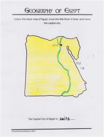 EGYPT’S GEOGRAPHY: Print out a copy of my Basic Geography of Egypt Map and have your child colour it. Then together as a family search an atlas or online for the capital city of Egypt. Have your child write the answer on the worksheet. Your child could also write down the names of nearby seas. Please excuse any anomalies in the shape of the country or inaccuracies as the worksheet was drawn by hand and hence is not perfect.