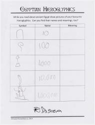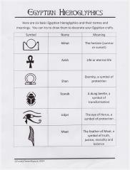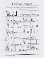 EGYPTIAN SYMBOLS: Use these Printables to learn more about Egyptian symbols: Egyptian Symbols/Alphabet—Use this chart for a basic phonetic alphabet. This has symbols linked with basic sounds (I found the information in a few places and I apologise for any inaccuracies in my drawings. I also discovered that some symbols had multiple sounds and some sounds had multiple symbols so I basically mixed a few of these together to get one simple phonetic alphabet. I am not an Egyptologist so I’m sure I’ve made a few errors but hopefully enough is correct for learning purposes. Here are my sources: http://mrswarnerarlington.weebly.com/unit-44-seeker-of-knowledge.html and http://art-zoo.tripod.com/artgallery/id14.html and http://discoveringegypt.com/egyptian-hieroglyphic-writing/egyptian-hieroglyphic-alphabet/ and this really great one http://www.artyfactory.com/egyptian_art/egyptian_hieroglyphs/egyptian_hieroglyphs_A-B-C.htm. Egyptian Hieroglyphics—I found some symbols here: http://www.egyptartsite.com/symlst.html and here http://www.ancient-symbols.com/ancient_egyptian_symbols.html and here http://symboldictionary.net/?page_id=676 and here http://www.crystalinks.com/egyptiansymbols.jpg I apologise for any inaccuracies in my drawings. Blank Hieroglyphics Chart—As your family reads about Egypt you may discover some more hieroglyphics. Use this Blank Chart to record the ones you find and like. We discovered some basic symbols for numbers as we read. CARTOUCHE CRAFT: NOTE: A Cartouche is a collection of hieroglyphics that represent a royal name. The symbols are encircled by an oval with a line at the bottom. For more information check here: http://en.wikipedia.org/wiki/Cartouche Materials: Some coloured paper, a pencil, black marker, a copy of my Egyptian Symbols worksheet. Step 1: Draw an oval on the paper and add a line at the bottom. Step 2: Have your child try to copy the symbols that correspond to the letters or sounds in his/her name.