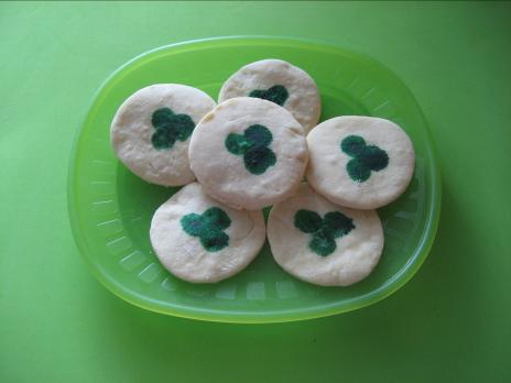 DESSERT: Cookies: If you have a shamrock cookie cutter make some shamrock shaped sugar cookies and decorate with green decorating sugar OR do like we did and make circle cookies but create fingerprint shamrocks by using green food colouring to decorate them on top. Shamrock Cake: Many cake books show shamrock cakes. Don’t forget to use green icing!
