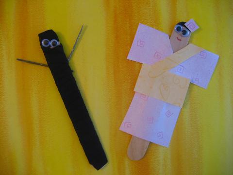 NINJA CRAFT STICKS and GEISHA CRAFT STICKS: NOTE: Our delve into Japan had to include Ninja since my youngest just loves them (thanks to LEGO Ninjago) so I came up with this simple craft. NOTE: A ninja was a covert agent of feudal Japan (http://en.wikipedia.org/wiki/Ninja) and geisha are traditional Japanese female entertainers (http://en.wikipedia.org/wiki/Geisha). Materials: Wide craft sticks, googly eyes, black ribbon or fabric, colourful patterned paper, toothpicks, black and red marker. Draws eyes closed add nice scrap paper pattern cut into