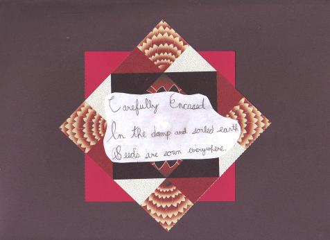 HAIKU: A haiku is a Japanese poem usually about nature with a slight twist ending that follows the syllable count of 5 in the first line, 7 in the second line and 5 in the last line. Encourage your child to write his/her own haiku and perhaps decorate it as my son did. NOTE: For a good picture book that is written in haiku try One Leaf Rides the Wind, by Celeste Davidson Mannis and pictures by Susan Kathleen Hartung, Puffin books, 2002.