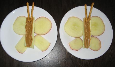 Apple Butterflies: Ingredients: 1 apple (sliced into thin rounds), a piece of celery per butterfly, peanut butter or cream cheese, pretzel sticks. Step 1: Spread celery with peanut butter or cream cheese and place one on each plate. Step 2: Arrange apple slices around the celery body to make the butterfly wings. Step 3: Stick two pretzel sticks into the peanut butter or cream cheese at the top of the celery stick to make antennae for each butterfly.