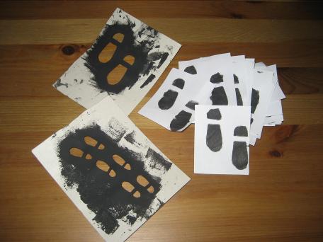 Materials: Pencil, construction paper (any type of hard paper like from a cereal box or the back of a notebook would work, too), craft knife (for parent use only), a cutting board, white paper (if you are making the footprints for the game), black or brown paint, a paint sponge or paint brushes, art smock or old clothes, newspaper or plastic to cover the table.