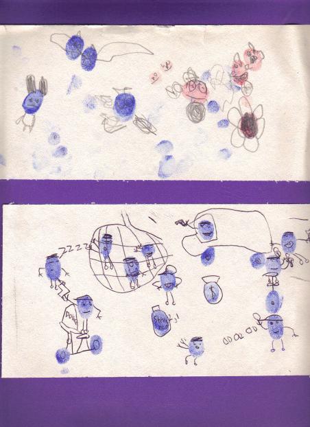 Step 1: Help your child press his her finger onto an ink stamp pad and then press his/her finger to a sheet of white paper. Step 2: Help your child wash his/her hands. Step 3: Give your child the coloured pencils or makers and let him/her decorate the fingerprints turning them into animals or people to create a scene.